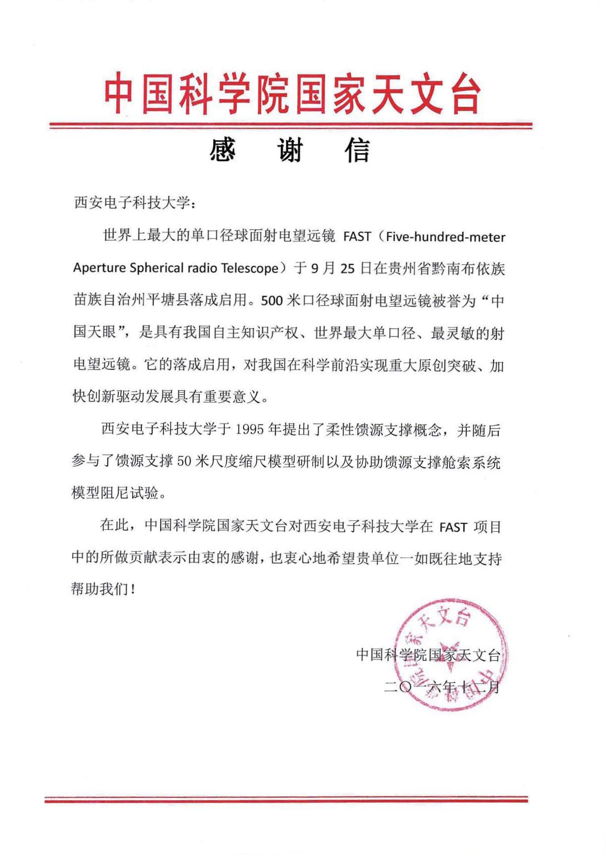 感谢信对段院士团队提出的柔性支撑馈源结构创新性设计表示了赞扬,肯定了皇冠正规娱乐平台50米实验模型对整个项目论证的重大作用,表示由衷感谢的同时,并期望利用西电智慧进一步展开合作,为FAST的平稳运行提供保障。