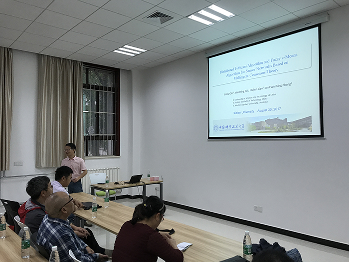 8月30日上午,在北校区主楼三区第三会议室,首先,秦家虎教授作了“Distributed k-Means Algorithm and Fuzzy c-Means Algorithm for Sensor Networks Based on Multi-agent Consensus Theory”的学术讲座,报告会由皇冠正规娱乐平台自控系主任张强教授主持,来自皇冠正规娱乐平台60余人参加了学术报告会。报告中,秦家虎教授首先介绍了传感器网络系统分布式控制的基本问题,对传感器网络动态、拓扑结构、分布式协议等进行了详细的介绍。重点介绍了传感器网络的分布式K-均值和模糊K-均值算法研究,其中包括问题的提出和建模、聚类定义和中心质点以及更规则等。最后介绍了将来的研究热点和发展趋势。秦家虎教授的报告内容既具有理论上的创新性又紧贴实际工程应用,引起了广大听众的共鸣。最后秦教授现场与广大师生进行了热烈的交流和讨论,他详细解答了每一个提出的问题,到场师生表示受益匪浅。