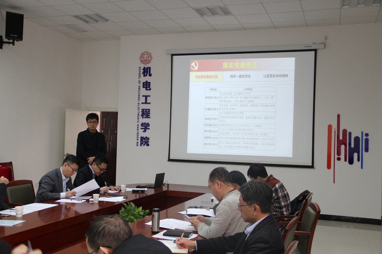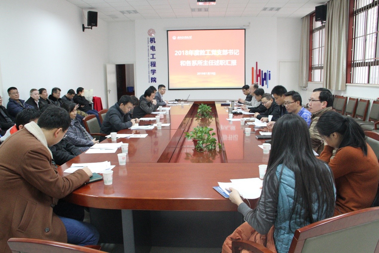 电子机械系、工业设计系、自动控制系、电气工程系、测控工程与仪器系、电子封装系和机电科技研究所教工党支部书记和系主任14人进行了现场述职。教工党支部书记主要从支部党建责任落实、支部质量提升工作开展、抓思想政治工作和师德师风教育,推进“课程思政”的情况、支部服务系所发展的情况、工作亮点及存在的问题展开汇报本支部2018年的支部建设成效。系主任主要从教育教学、人才培养、师资队伍建设、科研成果、学科发展和专业建设、平台建设、国际交流、产学合作等方面对2018年全年工作进行总结,梳理所在学科服务学校发展战略、对接“一流建设”的关键数据,进行对比分析,总结创新性成果,突出工作亮点。