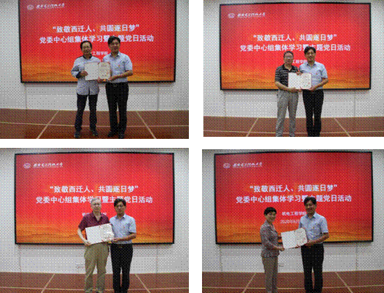 学院执行院长黄进为今年荣休的杨振江、王水平、宣宗强、盛英四位老教师颁发“荣休证书”,感谢他们为学院建设发展作出了一生的贡献。