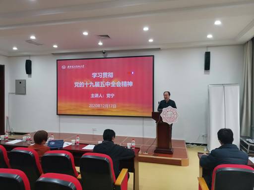 党宁以党的十九届五中全会召开为背景,从四个方面带领广大师生深入学习了会议精神。一是要深刻认识我国进入新发展阶段的重大意义、有利条件和重要特征。党宁指出,当前我国发展仍处于重要战略机遇期,机遇和挑战都有新的发展变化,过去是顺势而上,大环境相对平稳,互补性更多;现在是顶风而上,世界形势动荡复杂,竞争性更多。我们一定要坚持正确的历史观、大局观、发展观,用全面、辩证、长远的眼光看问题,积极拓展发展新空间。二是要准确把握2035年远景目标和“十四五”时期我国发展的指导方针、主要目标、重点任务,新时代新阶段的发展必须贯彻新发展理念,必须是高质量发展。三是要牢牢把握构建新发展格局的战略构想和重要着力点,构建新发展格局是事关全局的系统性、深层次变革,构建新发展格局是我国发展新阶段要求、塑造国际合作和竞争新优势的必然选择。四是要坚持党的全面领导,动员各方面力量为实现“十四五”规划和2035年远景目标而团结奋斗。