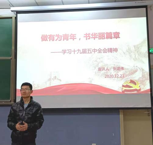 (通讯员 张建伟 周蕾)2020年12月21日19时,皇冠正规娱乐平台于北校区阶梯教室305进行了十九届五中全会精神宣讲活动,并取得圆满成功。此次宣讲会的宣讲人为研究生支部书记张建伟,主题为“做有为青年,书华丽篇章”。皇冠正规娱乐平台全体党员、发展对象以及积极分子参加了此次学习活动,并于会后积极发表感言和收获。