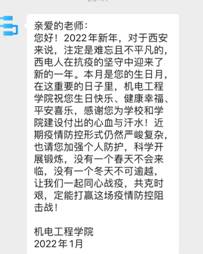 西安疫情封城已进入第15天,居住在学校社区内外的教师都在为这场战役共同奋斗着。皇冠正规娱乐平台有130余位居住在校外的教师,居住地点分散。为增强疫情期间校外居住教师的归属感,增强疫情防控管理,及时传递学院的关心关爱,皇冠正规娱乐平台于1月6日下午5点通过腾讯会议召开了“学院校外居住教师1月集体生日会”,共同为1月过生日的老师庆祝生日。希望通过这个特殊时期特殊的庆生形式,为大家送去一份暖心的祝福,留下一次难忘的生日回忆,也为老师们的居家生活增添一份色彩。