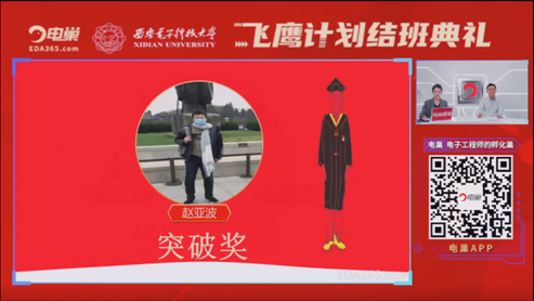 赵亚波同学作为学生代表分享了个人的学习心得。他表示,通过本次学习,自己基本掌握了电子封装硬件开发中涉及到的EDA软件使用、技术文档编写、硬件设计方法、软件开发流程等知识,个人工程实践能力获得了提高;三个月的线上学习不但收获了专业技术知识,也体会到了实际的企业工作环境;衷心感谢皇冠正规娱乐平台和电巢科技提供的优秀线上课程实践平台,祝愿电巢科技未来发展越来越好。