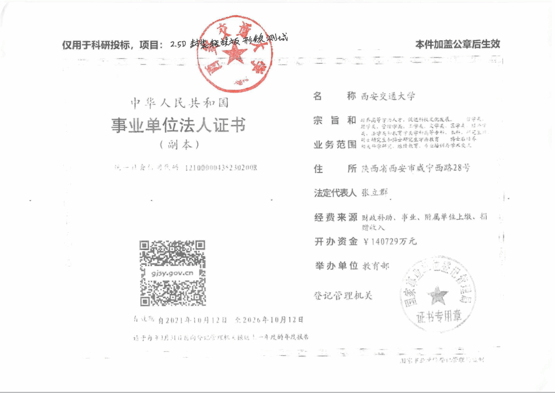 按照《皇冠正规娱乐平台科研协作项目管理办法(试行)》文件规定,为加强学校科研协作项目的管理,确保面向射频器件2.5D封装转接板多场耦合可靠性研究的顺利进行。西安交通大学与项目负责人王永坤将开展科研合作,现将合作相关事项公示如下: